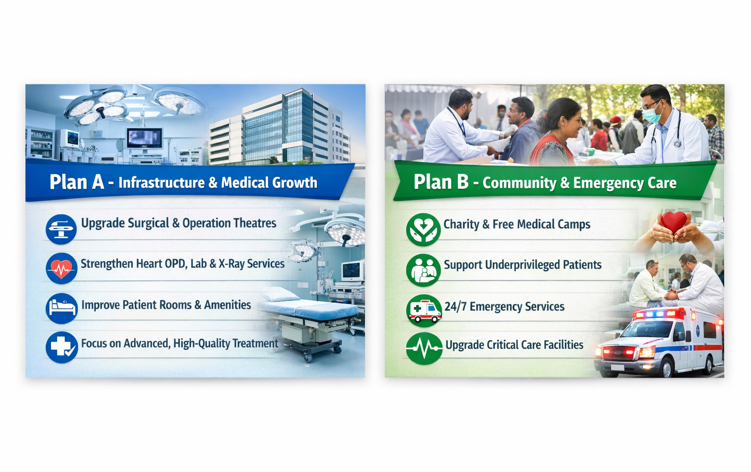 Under Plan B, our focus will be on expanding charitable and community healthcare initiatives. We will organize regular Donation Drives, Free Medical Camps, and Charity Health Programs to support underprivileged communities.